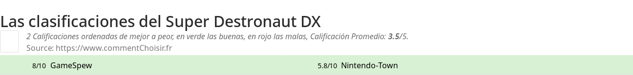 Aquí están las 2 revisiones y pruebas encontradas en el Videojuego Super Destronaut DX con las 2 calificaciones y comentarios de los evaluadores en su revisión.
