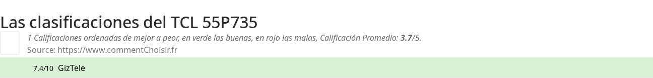 Aquí están las 2 revisiones y pruebas encontradas en el Televisores TCL 55P735 con las 2 calificaciones y comentarios de los evaluadores en su revisión.