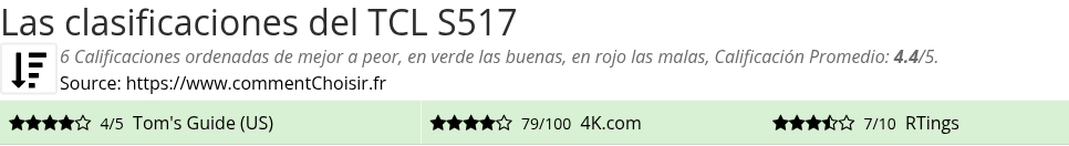 Las calificaciones de los sitios de Internet y las revistas pueden estar sesgadas, al menos con las reseñas de los clientes y los usuarios que compraron TCL S517 en Amazon o Fnac, estamos seguros de que tenemos reseñas reales sobre este producto. (los enlaces a las tiendas son patrocinados)