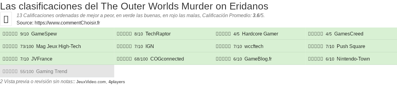 Entre estas pruebas de sitios de Internet y revistas especializadas en Videojuego, 13 dieron una calificación y obtenemos una calificación promedio de 3.6/5 para este producto The Outer Worlds.