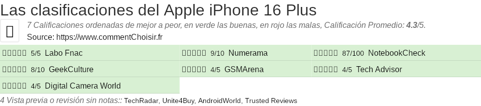 Para una mejor comparación, hemos investigado para usted las ventajas y desventajas de Apple iPhone 16 Plus y las notas de datos de los sitios especializados.