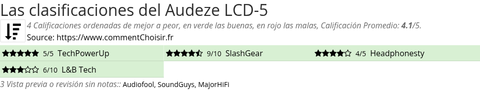 Entre estas pruebas de sitios de Internet y revistas especializadas en Auriculares, 4 dieron una calificación y obtenemos una calificación promedio de 4.1/5 para este producto Audeze.