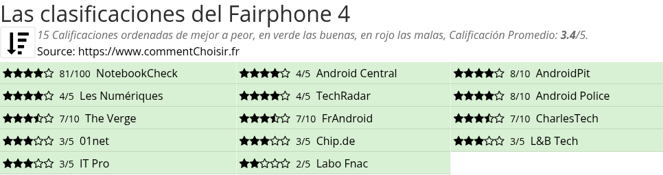 Entre estas pruebas de sitios de Internet y revistas especializadas en Smartphones, 15 dieron una calificación y obtenemos una calificación promedio de 3.4/5 para este producto Fairphone.