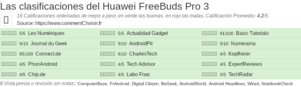 Entre estas pruebas de sitios de Internet y revistas especializadas en Auriculares, 16 dieron una calificación y obtenemos una calificación promedio de 4.2/5 para este producto Huawei.