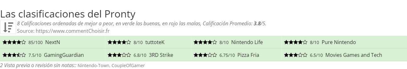 Entre estas pruebas de sitios de Internet y revistas especializadas en Videojuego, 8 dieron una calificación y obtenemos una calificación promedio de 3.6/5 para este producto Pronty.