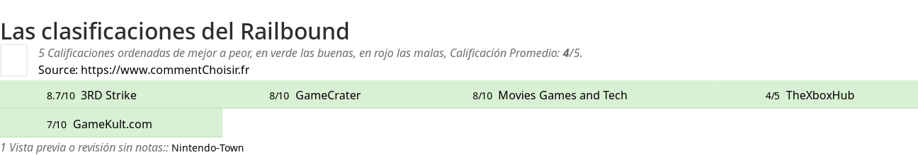 Entre estas pruebas de sitios de Internet y revistas especializadas en Videojuego, 5 dieron una calificación y obtenemos una calificación promedio de 3.9/5 para este producto Railbound.
