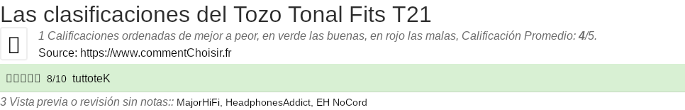 Tozo Tonal Fits T21 analisis: Solo hemos encontrado una prueba sobre este producto, por lo que es difícil dar una opinión general y esta calificación de 4/5 no puede ser realmente representativa.