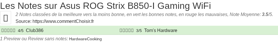 Les notes des sites et magazines internet peuvent etre peut-etre biaisés, au moins avec les avis client et des utilisateurs qui ont acheté Asus ROG Strix B850-I Gaming WiFi sur amazon ou la fnac, on est sur d'avoir de vrais critiques sur ce produit. (les liens vers les magasins sont sponsorisés).