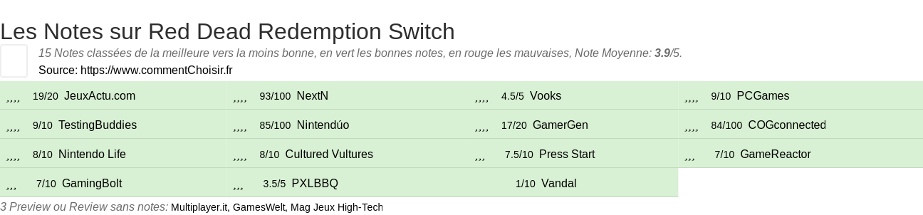 Les notes des sites et magazines internet peuvent etre peut-etre biaisés, au moins avec les avis client et des utilisateurs qui ont acheté Red Dead Redemption Switch sur amazon ou la fnac, on est sur d'avoir de vrais critiques sur ce produit. (les liens vers les magasins sont sponsorisés). Pour les jeux et quand cela est est possible nous listons aussi les notes moyennes sur les plateformes de consommateurs (comme IGDB)
