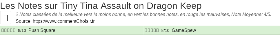 Les notes des sites et magazines internet peuvent etre peut-etre biaisés, au moins avec les avis client et des utilisateurs qui ont acheté Tiny Tina Assault on Dragon Keep sur amazon ou la fnac, on est sur d'avoir de vrais critiques sur ce produit. (les liens vers les magasins sont sponsorisés). Pour les jeux et quand cela est est possible nous listons aussi les notes moyennes sur les plateformes de consommateurs (comme IGDB)