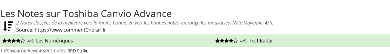 Les notes des sites et magazines internet peuvent etre peut-etre biaisés, au moins avec les avis client et des utilisateurs qui ont acheté Toshiba Canvio Advance sur amazon ou la fnac, on est sur d'avoir de vrais critiques sur ce produit. (les liens vers les magasins sont sponsorisés).