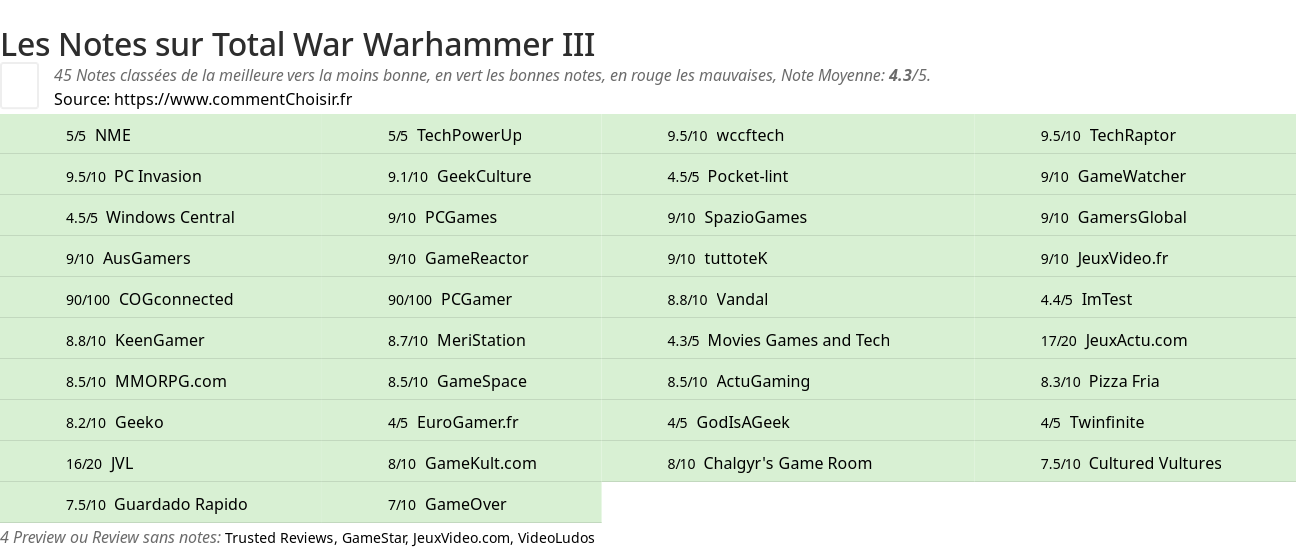 Pour mieux comparer, nous avons cherché pour vous les avantages et inconvénients de Total War Warhammer III et les notes données par les sites spécialisés.