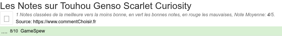 Parmis ces tests des sites & magazines internet spécialisés dans les Jeux, 1 ont donné une note et on obtient une note moyenne de 4/5 pour ce produit de Touhou Genso.