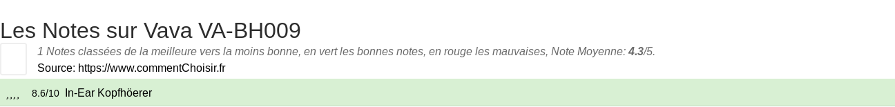 Voici tous les 1 avis et les tests que nous avons trouvé sur le Casque Vava VA-BH009 avec les 1 notes et les commentaires des testeurs dans leur review.