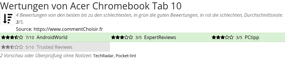 Hier sind alle 7 tests und Bewertungen zu Notebooks Acer Chromebook Tab 10 mit den 4 Bewertungen und Kommentaren der Tester in ihrem Test.