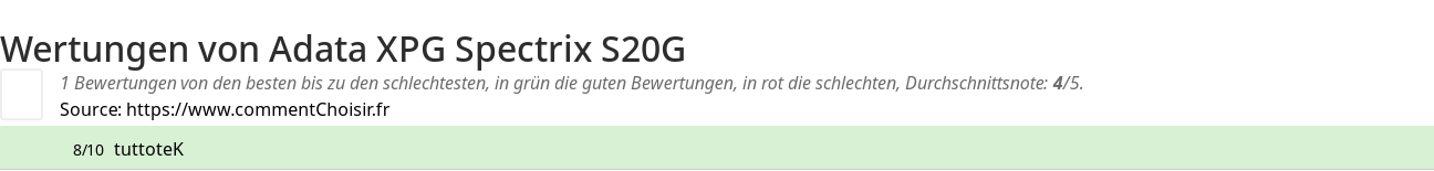 Adata XPG Spectrix S20G test : Wir haben nur eine Rezension zu diesem Produkt gefunden, daher klingt es schwierig, einen globalen Ratschlag zu geben. Diese durchschnittliche Bewertung von 4/5 ist möglicherweise nicht repräsentativ.
