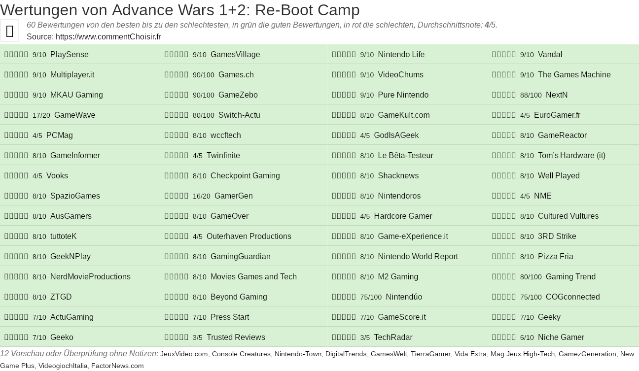 Hier sind alle 76 tests und Bewertungen zu Videospiele Advance Wars 1+2: Re-Boot Camp mit den 60 Bewertungen und Kommentaren der Tester in ihrem Test.