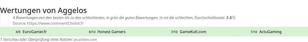Hier sind alle 5 tests und Bewertungen zu Videospiele Aggelos mit den 4 Bewertungen und Kommentaren der Tester in ihrem Test.