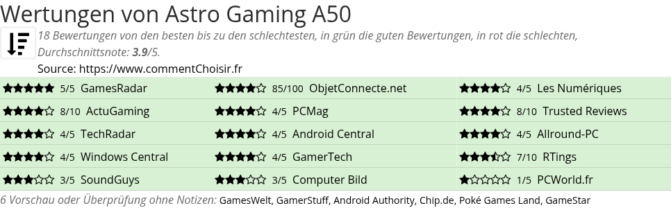 Hier sind alle 25 tests und Bewertungen zu Headsets Astro Gaming A50 mit den 18 Bewertungen und Kommentaren der Tester in ihrem Test.