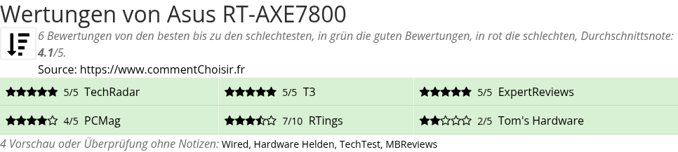 Asus RT-AXE7800 test : Mit einer durchschnittlichen Bewertung von 4.1/5 können Sie Asus RT-AXE7800 mit geschlossenen Augen (oder fast) kaufen. Die Meinungen der Tester scheinen einhellig zu sein!