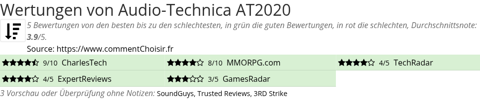 Hier sind alle 10 tests und Bewertungen zu Videospiele Audio-Technica AT2020 mit den 5 Bewertungen und Kommentaren der Tester in ihrem Test.