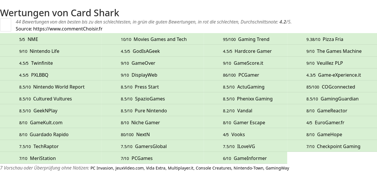 Hier sind alle 51 tests und Bewertungen zu Videospiele Card Shark mit den 44 Bewertungen und Kommentaren der Tester in ihrem Test.