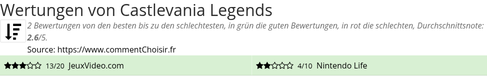 Hier sind alle 2 tests und Bewertungen zu Videospiele Castlevania Legends mit den 2 Bewertungen und Kommentaren der Tester in ihrem Test.