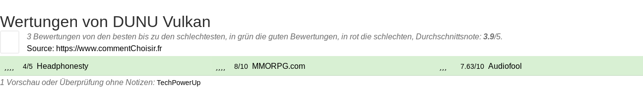 Hier sind alle 4 tests und Bewertungen zu Headsets DUNU Vulkan mit den 3 Bewertungen und Kommentaren der Tester in ihrem Test.