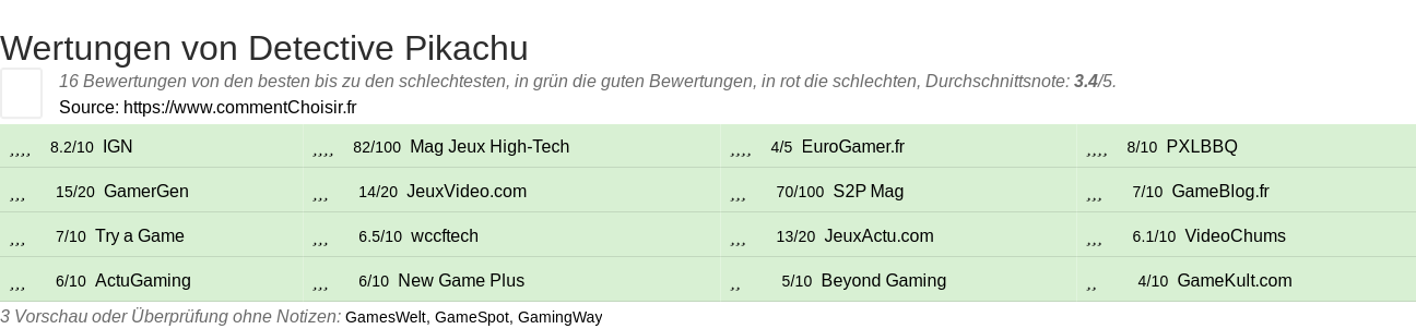 Hier sind alle 19 tests und Bewertungen zu Videospiele Detective Pikachu mit den 16 Bewertungen und Kommentaren der Tester in ihrem Test.