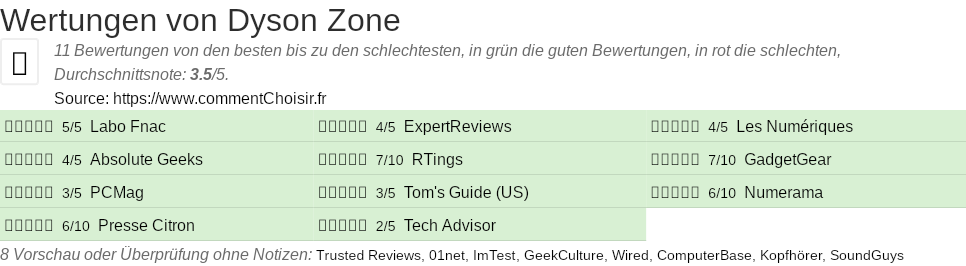 Hier sind alle 19 tests und Bewertungen zu Headsets Dyson Zone mit den 11 Bewertungen und Kommentaren der Tester in ihrem Test.