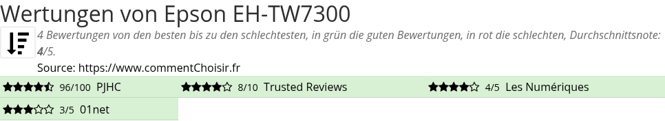 Hier sind alle 4 tests und Bewertungen zu Beamer Epson EH-TW7300 mit den 4 Bewertungen und Kommentaren der Tester in ihrem Test.