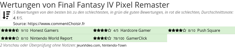 Final Fantasy IV Pixel Remaster test : Mit einer durchschnittlichen Bewertung von 4.1/5 können Sie Final Fantasy IV Pixel Remaster mit geschlossenen Augen (oder fast) kaufen. Die Meinungen der Tester scheinen einhellig zu sein!