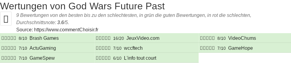 Hier sind alle 9 tests und Bewertungen zu Videospiele God Wars Future Past mit den 9 Bewertungen und Kommentaren der Tester in ihrem Test.