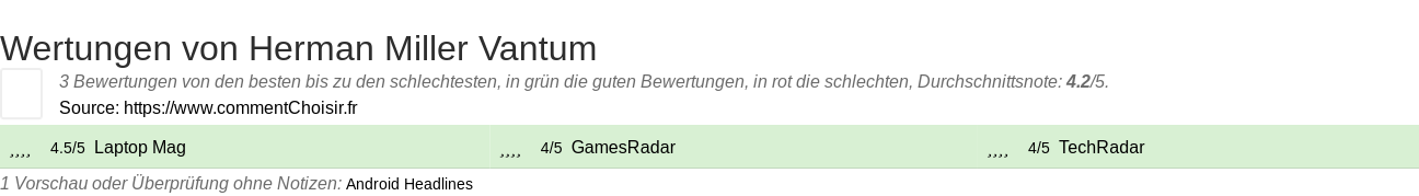 Hier sind alle 4 tests und Bewertungen zu Gaming Herman Miller Vantum mit den 3 Bewertungen und Kommentaren der Tester in ihrem Test.
