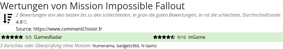Hier sind alle 5 tests und Bewertungen zu Filme und Serien Mission Impossible Fallout mit den 2 Bewertungen und Kommentaren der Tester in ihrem Test.