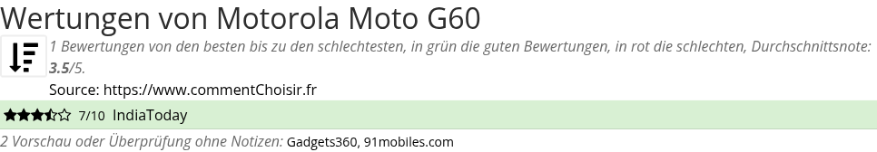 Motorola Moto G60 test : Wir haben nur eine Rezension zu diesem Produkt gefunden, daher klingt es schwierig, einen globalen Ratschlag zu geben. Diese durchschnittliche Bewertung von 3.5/5 ist möglicherweise nicht repräsentativ.