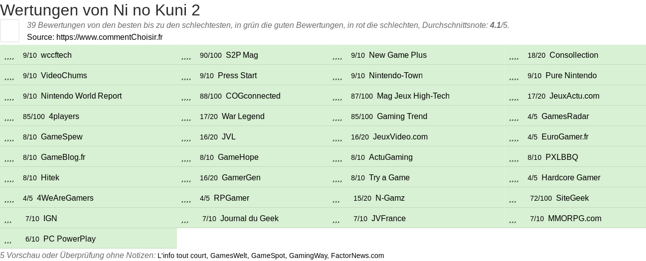Hier sind alle 48 tests und Bewertungen zu Videospiele Ni no Kuni 2 mit den 39 Bewertungen und Kommentaren der Tester in ihrem Test.