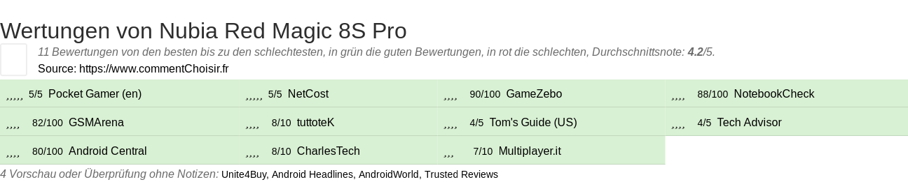 Hier sind alle 15 tests und Bewertungen zu Smartphones Nubia Red Magic 8S Pro mit den 11 Bewertungen und Kommentaren der Tester in ihrem Test.