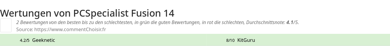 Hier sind alle 2 tests und Bewertungen zu Notebooks PCSpecialist Fusion 14 mit den 2 Bewertungen und Kommentaren der Tester in ihrem Test.