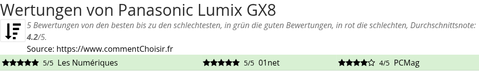 Hier sind alle 5 tests und Bewertungen zu Kameras Panasonic Lumix GX8 mit den 5 Bewertungen und Kommentaren der Tester in ihrem Test.