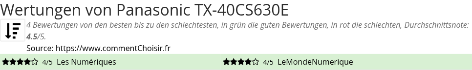 Hier sind alle 4 tests und Bewertungen zu Fernseher Panasonic TX-40CS630E mit den 4 Bewertungen und Kommentaren der Tester in ihrem Test.