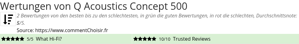 Hier sind alle 2 tests und Bewertungen zu Lautsprecher Q Acoustics Concept 500 mit den 2 Bewertungen und Kommentaren der Tester in ihrem Test.