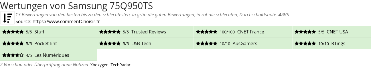 Hier sind alle 15 tests und Bewertungen zu Fernseher Samsung 75Q950TS mit den 13 Bewertungen und Kommentaren der Tester in ihrem Test.