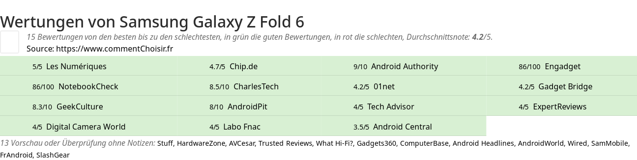 Samsung Galaxy Z Fold 6 test : Mit einer durchschnittlichen Bewertung von 4.1/5 können Sie Samsung Galaxy Z Fold 6 mit geschlossenen Augen (oder fast) kaufen. Die Meinungen der Tester scheinen einhellig zu sein!