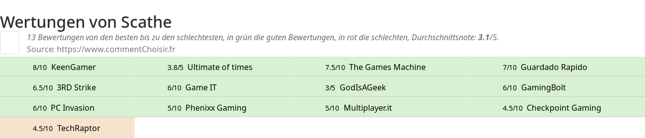 Hier sind alle 14 tests und Bewertungen zu Videospiele Scathe mit den 13 Bewertungen und Kommentaren der Tester in ihrem Test.