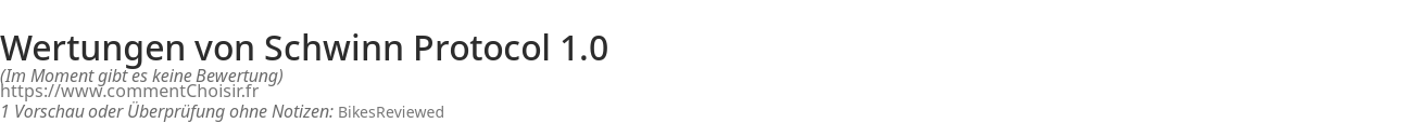 Hier sind alle 1 tests und Bewertungen zu Fahrrad Schwinn Protocol 1.0 mit den 0 Bewertungen und Kommentaren der Tester in ihrem Test.
