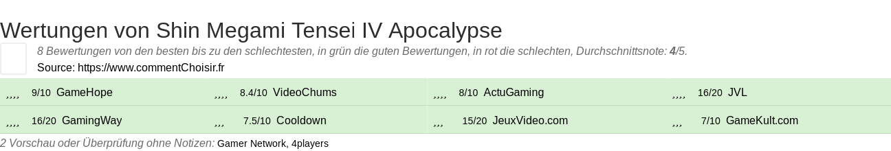 Hier sind alle 10 tests und Bewertungen zu Videospiele Shin Megami Tensei IV Apocalypse mit den 8 Bewertungen und Kommentaren der Tester in ihrem Test.