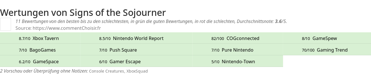Hier sind alle 13 tests und Bewertungen zu Videospiele Signs of the Sojourner mit den 11 Bewertungen und Kommentaren der Tester in ihrem Test.