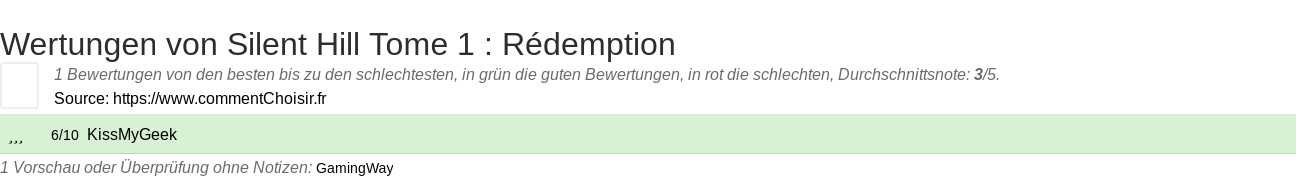 Hier sind alle 2 tests und Bewertungen zu Videospiele Silent Hill Tome 1 : Rédemption mit den 1 Bewertungen und Kommentaren der Tester in ihrem Test.