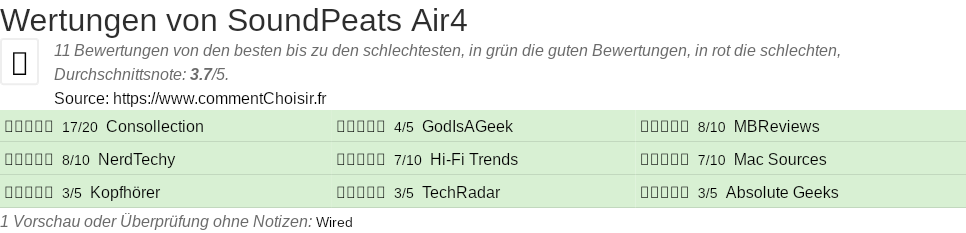 Hier sind alle 13 tests und Bewertungen zu Headsets SoundPeats Air4 mit den 12 Bewertungen und Kommentaren der Tester in ihrem Test.